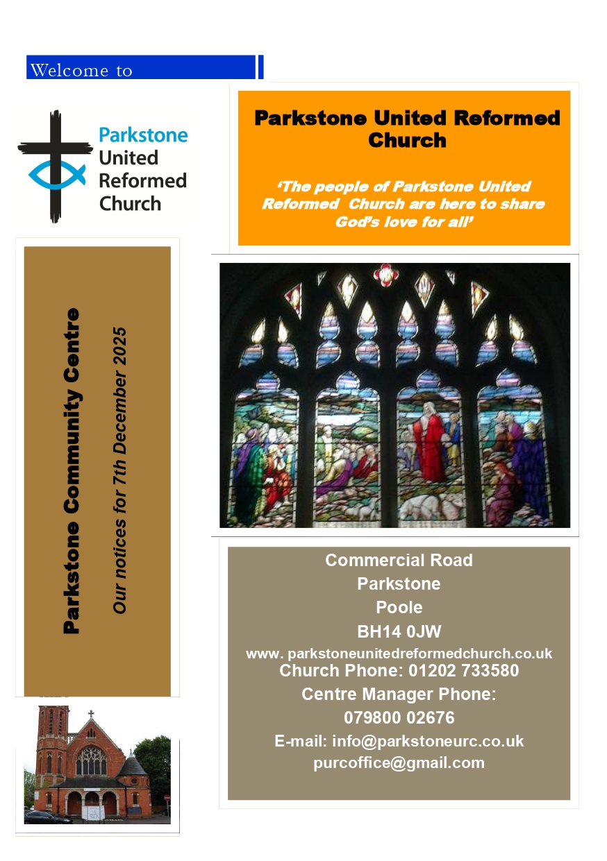 .Our Mission Statement is..."The people of Parkstone United Reformed Church are here to share God's love for all through welcome, service and care."Our Vision Statement is...Because of this understanding of who we are and what we are here