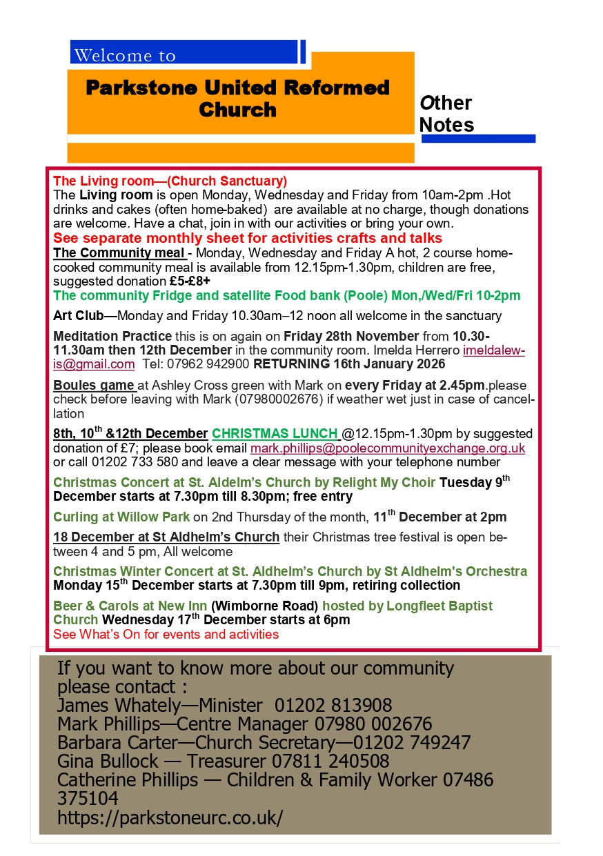 the Church as a whole.Extremely active within the Lower Parkstone and Poole area the Church is well known as a friendly meeting house and support location to many local groups and organisations – both Faith Groups and Community Groups